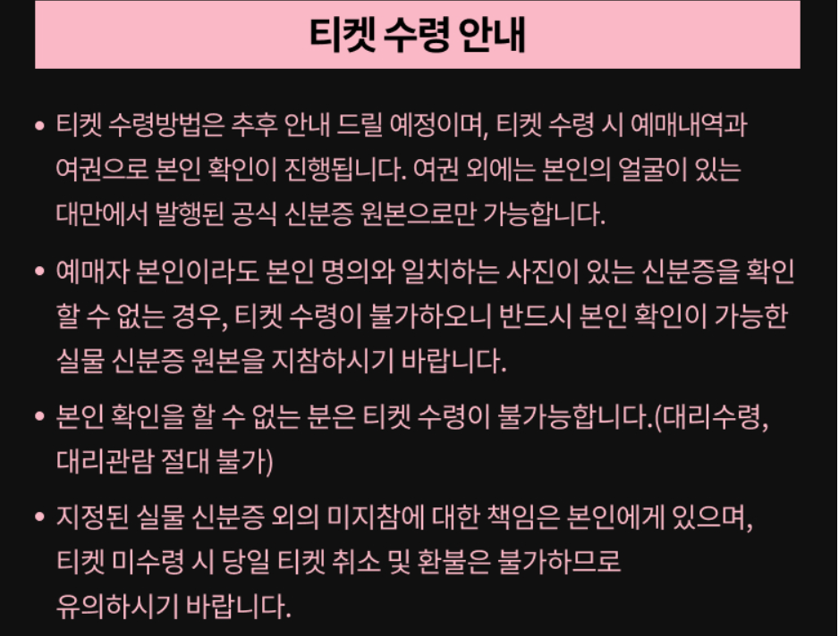 - 예매자는 반드시 본인 관람이 원칙 → 양도·대리수령 불가