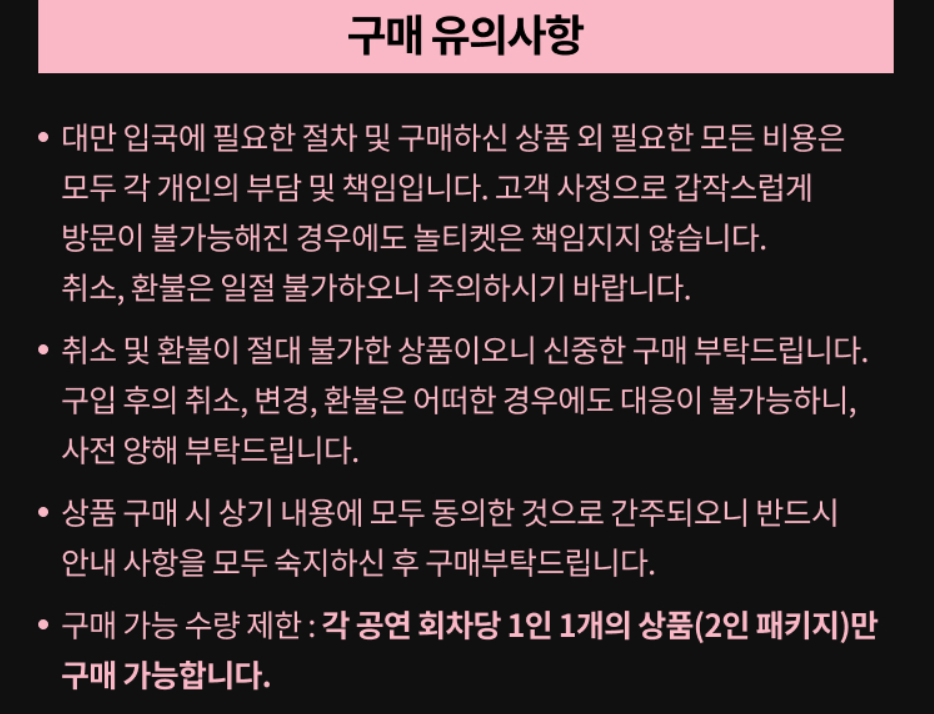 특히 이번 가오슝 콘서트는 환불불가 정책이 엄격하기 때문에, 예매 전 정책을 정확히 이해하지 못하면 공연 입장과 호텔 체크인에 큰 문제가 생길 수 있습니다. 또한, 좌석 배정·호텔 객실 배정이 모두 임의로 이루어지므로, 구매자는 이러한 점을 반드시 인지해야 합니다.