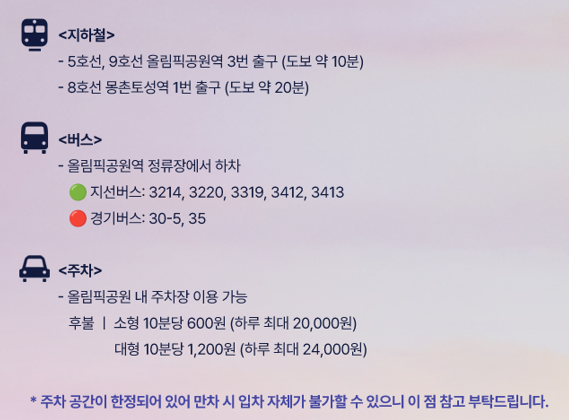 👉 정리하면, 가장 안전하고 빠른 방법은 지하철 5호선·9호선 올림픽공원역 3번 출구 이용입니다.