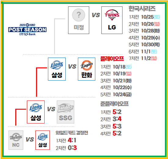 ※ 시리즈가 5차전까지 진행될 경우, 한국시리즈 개막일은 10월 26일(일)로 순연될 수 있습니다.