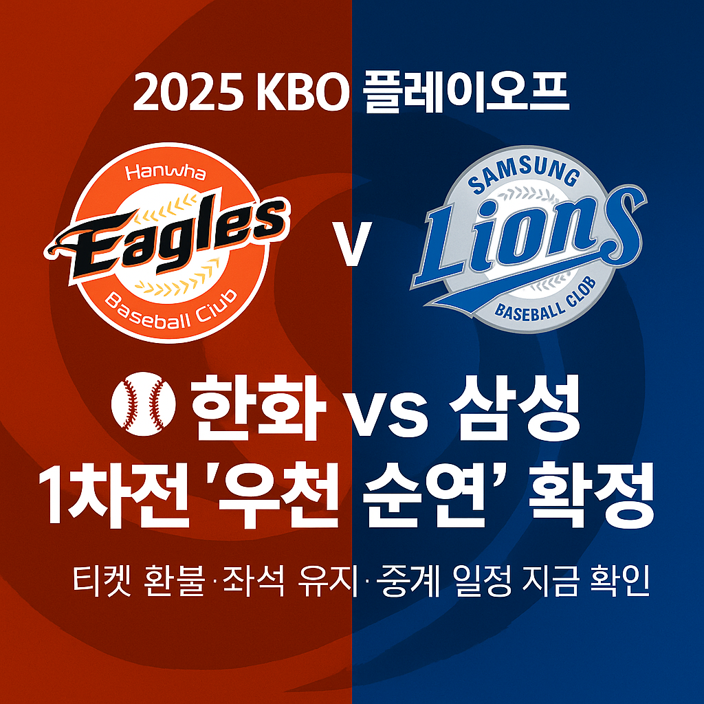 2025 KBO 플레이오프 한화 vs 삼성 1차전이 우천으로 순연 확정되었습니다. 변경된 경기 일정, 티켓 환불 규정, 좌석 유지, 지상파 중계 편성표까지 팬들이 꼭 알아야 할 최신 정보를 한 번에 정리했습니다.