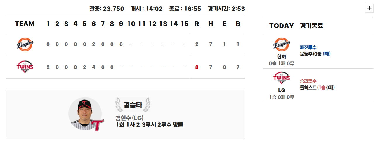 | 차전 | LG 트윈스 | 한화 이글스 | 결과 / 일정 |