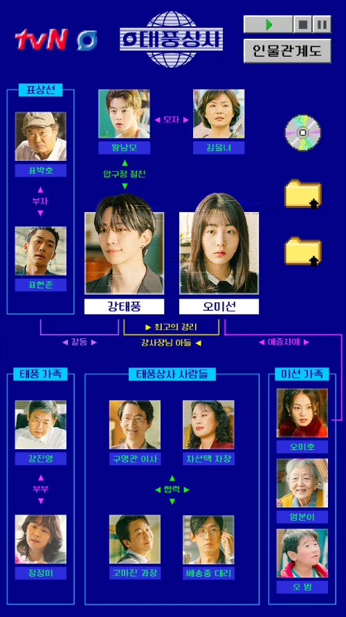 강태풍 | 26세. 태풍상사 사원 → 대표. “꽃은 피었다가 이기는 것”이라는 아버지의 말처럼 끝까지 버티며 회사를 지키려는 주인공. 잘생겼고 따뜻하지만 욱하는 기질·눈물 많음. |